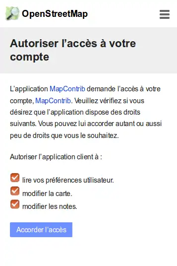 | Renseigner ses identifiants | MapContrib demande l'accès à certaines fonctionnalités de votre compte | Vous êtes authentifié comme contributeur, vous pouvez modifier et ajouter des Points d'Intérêts |