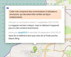 Notes est une fonction du site web OpenStreetMap.org ajoutée en avril 2013. Les visiteurs peuvent "Ajouter une Note" facilement pour signaler une erreur dans les données.