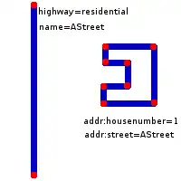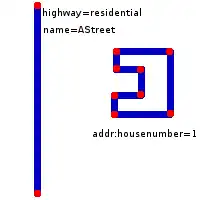 - Un ensemble de maisons le long d'une rue est représenté par une voie (way). Les numéros de début et de fin sont placés sur les nœuds (nodes) extrêmes de cette voie. Le type de numérotation (paire/impaire) est indiqué sur la voie elle-même.