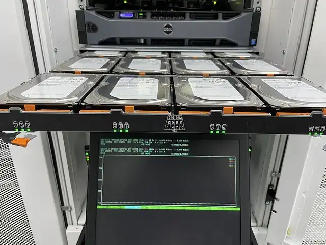 - 12 disques SAS 3To Seagate, configurés en vdev ZFS de 6 disques avec 2 disques de redondance (RaidZ2).