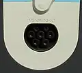 Connecteur Type 2 Format validé comme standard européen, le plus courant pour les nouvelles stations AC tel que l'impose la directive 2014/94/EU[4] Cette étiquette doit être utilisée s'il y a un câble attaché en permanence au chargeur. |