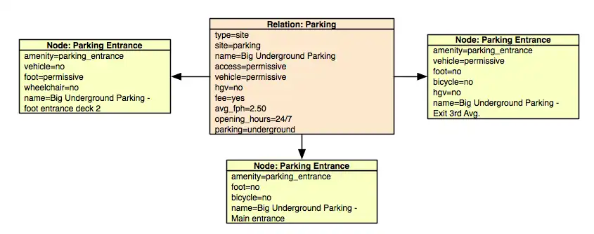 - Plusieurs entrées d'un même parking peuvent groupés ensemble, en les plaçant dans une même relation de type 'site' avec