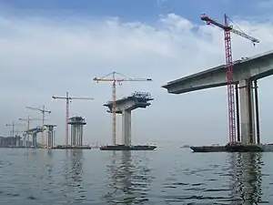 Le pont Pierre Pflimlin en construction sur le Rhin entre l'Allemagne et la France -