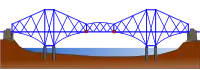 Le pont Forth a été achevé en 1890. Les poutres en treillis en forme de losange, reposant chacune sur quatre pieds, ont été érigées selon la méthode du porte-à-faux, puis reliées à des poutres de suspension. Seule la poutrelle centrale peut se déplacer longitudinalement sur ses fondations, tandis que les autres ne peuvent que faire tourner les colonnes sur leurs pieds. | |