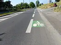 | Bande cyclable : bande de circulation latérale à l'usage des cyclistes, intégrée à la route principale, simplement séparée de la circulation automobile par un marquage au sol (une ligne de peinture, continue ou discontinue au sol), ou parfois par une petite bordure arrondie. |