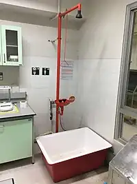 Une douche dit de sécurité pour les situations d'urgence. Cela sert principalement en cas de contamination chimique afin de diluer le produit.
