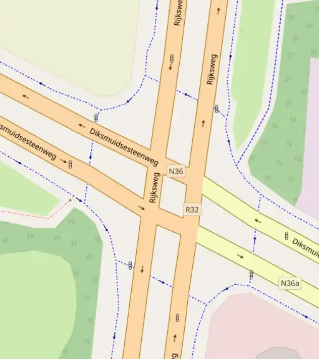 Ajouter des feux de circulation sur les nœuds à l'intersection des voies. Dans l'exemple, cela va créer deux feux de circulation séparés pour la voie verticale. Il reviendra au logiciel de navigation de considérer des feux proches comme un seul pour ne pas perturber le calcul du temps de trajet. Beaucoup de jonctions sont taguées ainsi pour des raisons de simplicité.