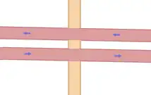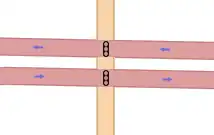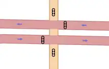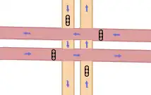 Les voies horizontales sont en fait une large voie représentée par deux voies à sens uniques. Le souci est que les feux de circulation devraient idéalement être ajoutés sur chaque voie une seule fois. Jusqu'à aujourd'hui, il n'y a pas de convention établie pour résoudre ce souci, mais les manières utilisées sont présentées ci-dessous.