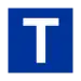 Merkin kohdalla ajovirta on katkaistava hetkeksi. Suorakaiteen muotoinen sininen merkki, jossa on valkoinen T-kirjain.