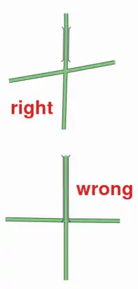 | Jokaista risteystä kohden tulisi olla piste risteyksen kohdalla ja pisteen tulee kuulua kumpaankin risteävistä teistä. Jos risteyksessä on mahdollista kulkea tieltä toiselle, on väärin piirtää toisen tien piste hieman risteävästä tiestä sivuun - tämä voi näyttää kartalla oikealta, mutta loogisesti ja esimerkiksi reititysohjelmien kannalta risteävien teiden yhteys puuttuu. | ![]() ![]() |