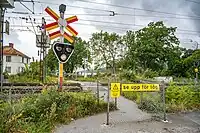 Kevyen liikenteen tasoristeys (jossa väylä ylittää rautatien samassa tasossa; eli ilman siltaa). Joissakin on automaattisesti toimivat puomit tai kiinteät hidastepuomit. Vartioiduissa tasoristeyksissä on yleensä vilkkuvat punaiset valot tai kellot (tai molemmat). Joissakin tasoristeyksissä, kuten pienemmillä asemilla olevissa laituripoluissa, ei ole puomeja vaan vain varoitusvalot.