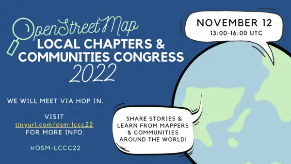 The Local Chapters and Communities Congress 2022 (LCCC 2022) is a virtual event where leaders and members of various OSM communities, whether they are officially recognized Local Chapters of the OSM Foundation or just a regular user group of OSM mappers, come together to share stories and learn from each other. Let’s get together and see what kinds of organizational efforts we can share together to support and grow our mapping communities!