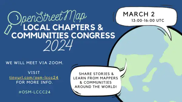 AboutThe Local Chapters and Communities Congress 2024 (LCCC 2024) is a virtual event where leaders and members of various OSM communities, whether they are officially recognized Local Chapters of the OSM Foundation or just a regular user group of OSM mappers, come together to share stories and learn from each other. Let’s get together and see what kinds of organizational efforts we can share together to support and grow our mapping communities! Check out the program from 2022 and event recordings! When