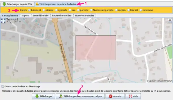 1. Téléchargez les données OSM de la zone souhaitée, puis avec le même bouton, changez d'onglet pour télécharger les données du cadastre : pensez à ne sélectionner que celles qui vous intéressent (eau permet d'importer les piscines privées). Attention, chargez ces nouvelles données dans un nouveau calque.