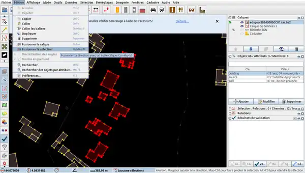 2. Avec l'outil de validation, on vérifie les collisions éventuelles issues de la fusion (bâtiment-bâtiment, bâtiment-route, bâtiment-rivière, etc.)