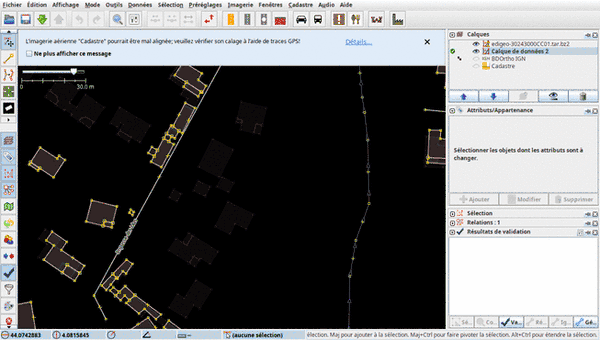 Il est ensuite indispensable de lancer le validateur OSM pour corriger tous les cas problématiques que la «conflation» a générés, notamment les cas de :