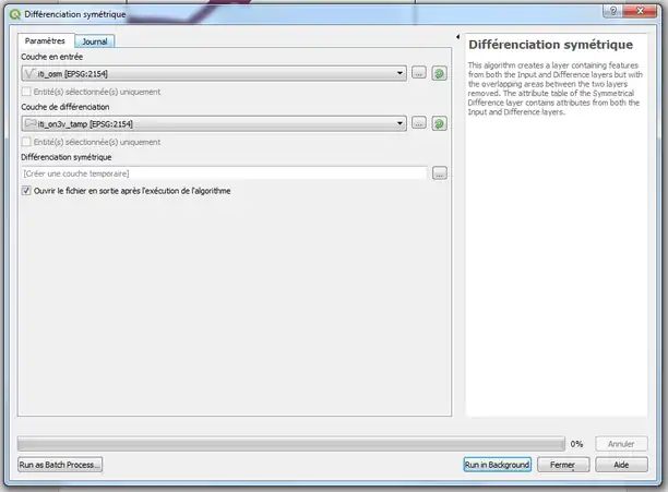 Une couche ON3V tampon est créée. Nous souhaitons conserver toutes les parties d’itinéraires qui ne se superposent pas pour créer une couche des différences/erreurs de cartographie. Pour cela on utilise : vecteur/outils de géotraitement/différenciation symétrique. La couche OSM correspond à la couche en entrée, la couche tampon ON3V à la couche de différenciation. Lancez le traitement. Ne prêtez pas attention aux messages d’erreurs en rouge, ils n’empêchent pas la réussite du traitement.