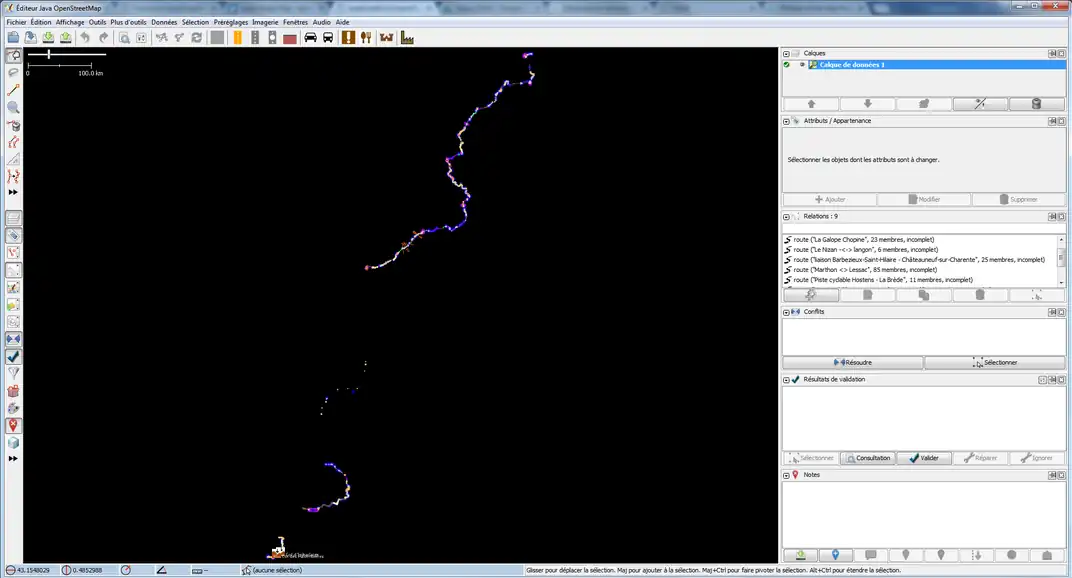 Ce tutoriel décrit une méthode permettant de comparer les données de l’ON3V et d’OSM. Il s’agit de l’étape permettant l’acquisition et la préparation des données nécessaires à la cartographie. Plus précisément, on cherche à mettre en évidence les différences de tracés des itinéraires cyclables entre les données de l’ON3V et les données d’Open Street Map. Un fichier cartographiant les différences entre les tracés est généré et il peut être importé sur JOSM pour aider aux corrections de la cartographie déjà réalisée. Il est également possible de créer un ratio de correspondance entre les deux bases pour évaluer la quantité de travail cartographique qu’il reste à effectuer. Il s’agit de l’étape permettant l’acquisition et la préparation des données nécessaires à la cartographie.