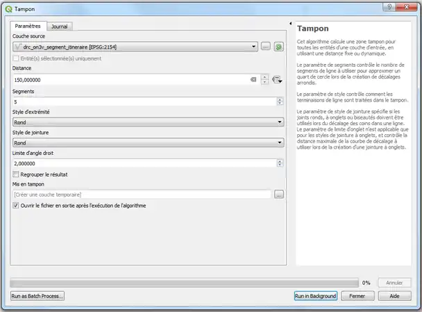 Sélectionnez la couche ON3V et indiquez une distance de 150 (le mètre est l’unité par défaut sur QGIS). Enregistrez votre nouvelle couche en shp.