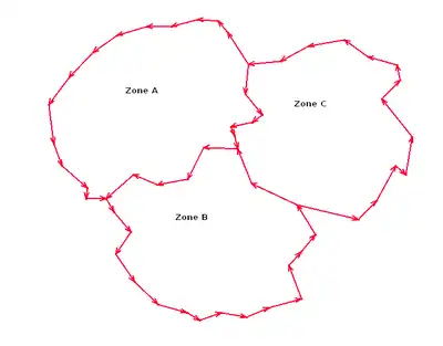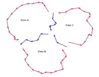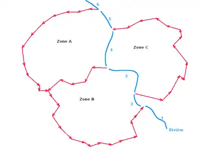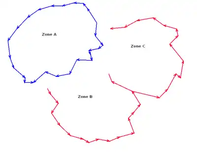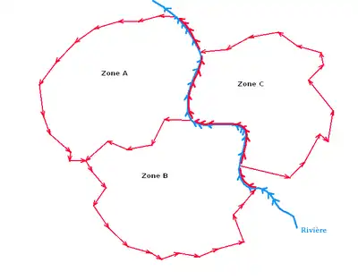 | Considérons trois zones A, B et C qui sont des entités administratives de niveau égal (des communes, par exemple). | ||||||||||||||||||||||||||||||||