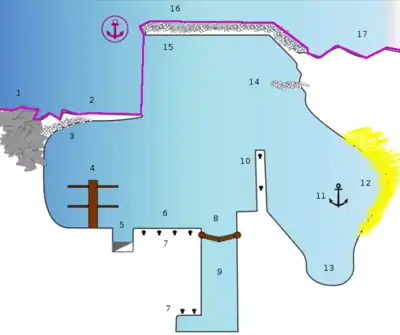 Il est très peu pratique de faire suivre à la limite administrative le contours de chaque quai et ponton situés à l'intérieur du port; de plus, certaines décisions de justice ont attribués à la commune la responsabilité et la légitimité sur ce qui se passe à l'intérieur du port (zone de mer enfermée partiellement par les limites en dur qui protègent de la houle). Il est donc proposé de choisir pour la limite de la commune le trait extérieur du port qui suit les barrières contre la houle. (Cette proposition n'est issue d'aucun consensus et uniquement proposée par sletuffe, à vous de choisir votre méthode) (Représentation ci-contre en violet de la limite utilisée en mer pour la commune, le département, la région et la relation france "trait de côte") |