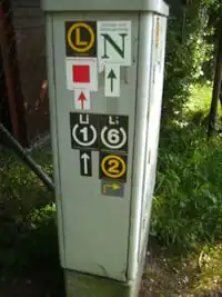 "weiße 1 im oben offenen Kreis darüber weißes W" (zum Beispiel) | "gelbe 4 im Kreis" (zum Beispiel) | "gelbes L im Kreis" (zum Beispiel) |