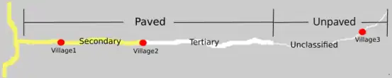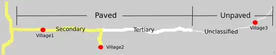 | The part of the road after village2 is tertiary because it leads to unpaved part. The part of the paved provincial road that serves villages is secondary. If there are no villages in-between the paved part, then the whole paved part must be tertiary (if it leads to unpvaved part). | ||