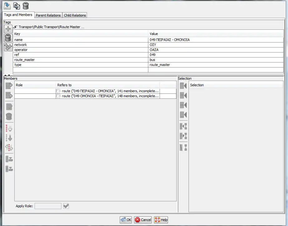 Θα δημιουργούνται δύο route relations ένα για κάθε κατεύθυνση (Αφετηρία=>Τέρμα, Τέρμα=>Αφετηρία) π.χ. 049 ΠΕΙΡΑΙΑΣ - ΟΜΟΝΟΙΑ & 049 ΟΜΟΝΟΙΑ - ΠΕΙΡΑΙΑΣ. Σε κάθε route relation θα καταχωρούνται ως μέλη (members) τα παραπάνω nodes, Στην λίστα αυτή για κάθε στάση θα καταχωρείται πρώτα το stop_position με role stop και μετά το platform με role platform ακολουθώντας την αλληλουχία των στάσεων που ακολουθεί το λεωφορείο / τρόλεϊ σε κάθε διαδρομή.
