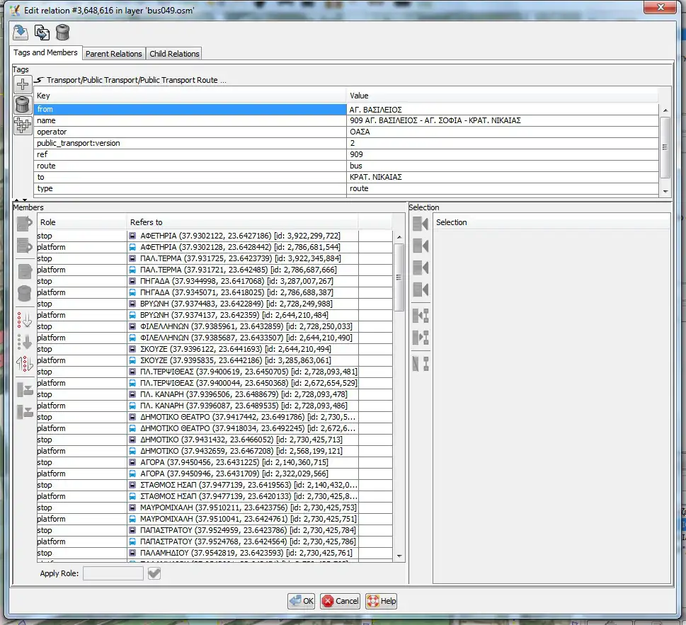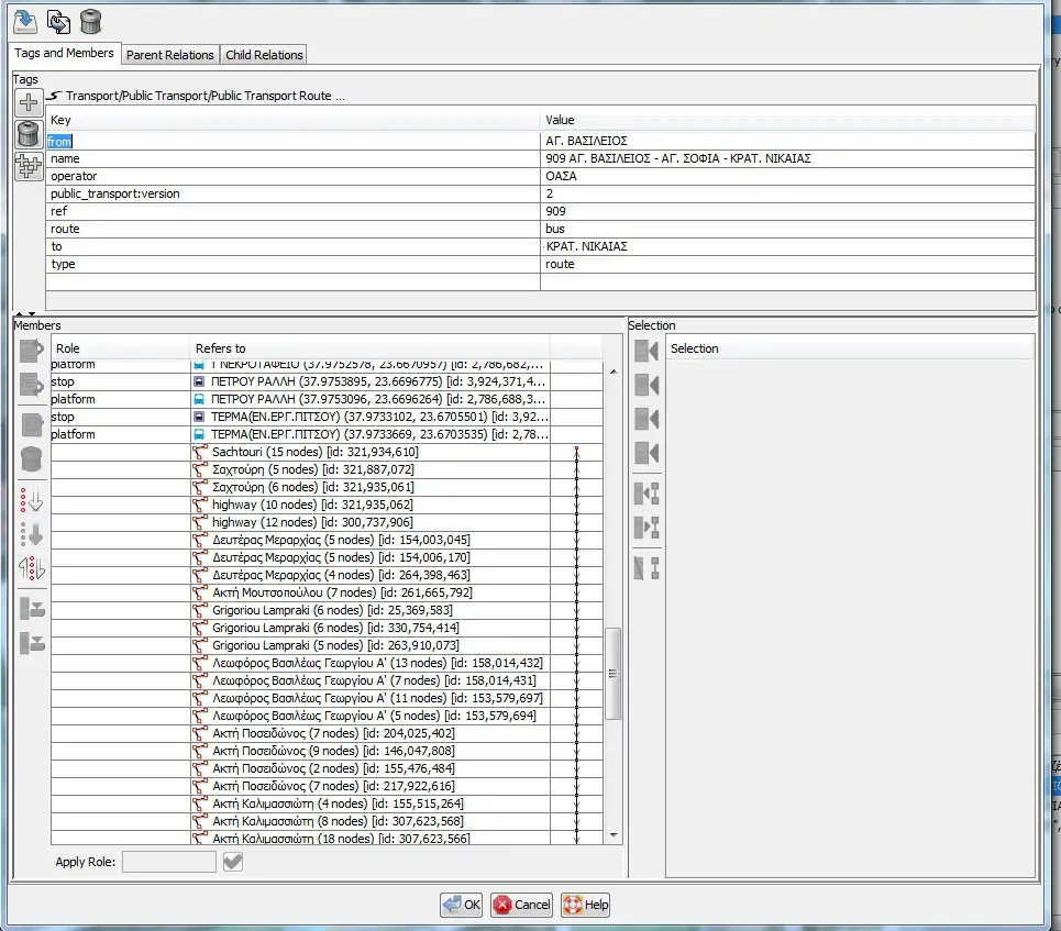 Παράδειγμα (στο Josm) route relation με τα tags και τα μέλη (members) με σωστή αλληλουχία: