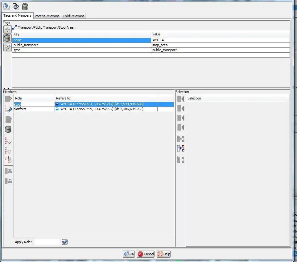 Παράδειγμα (στο Josm) με τα tags και τα μέλη (members) για stop_area relation.