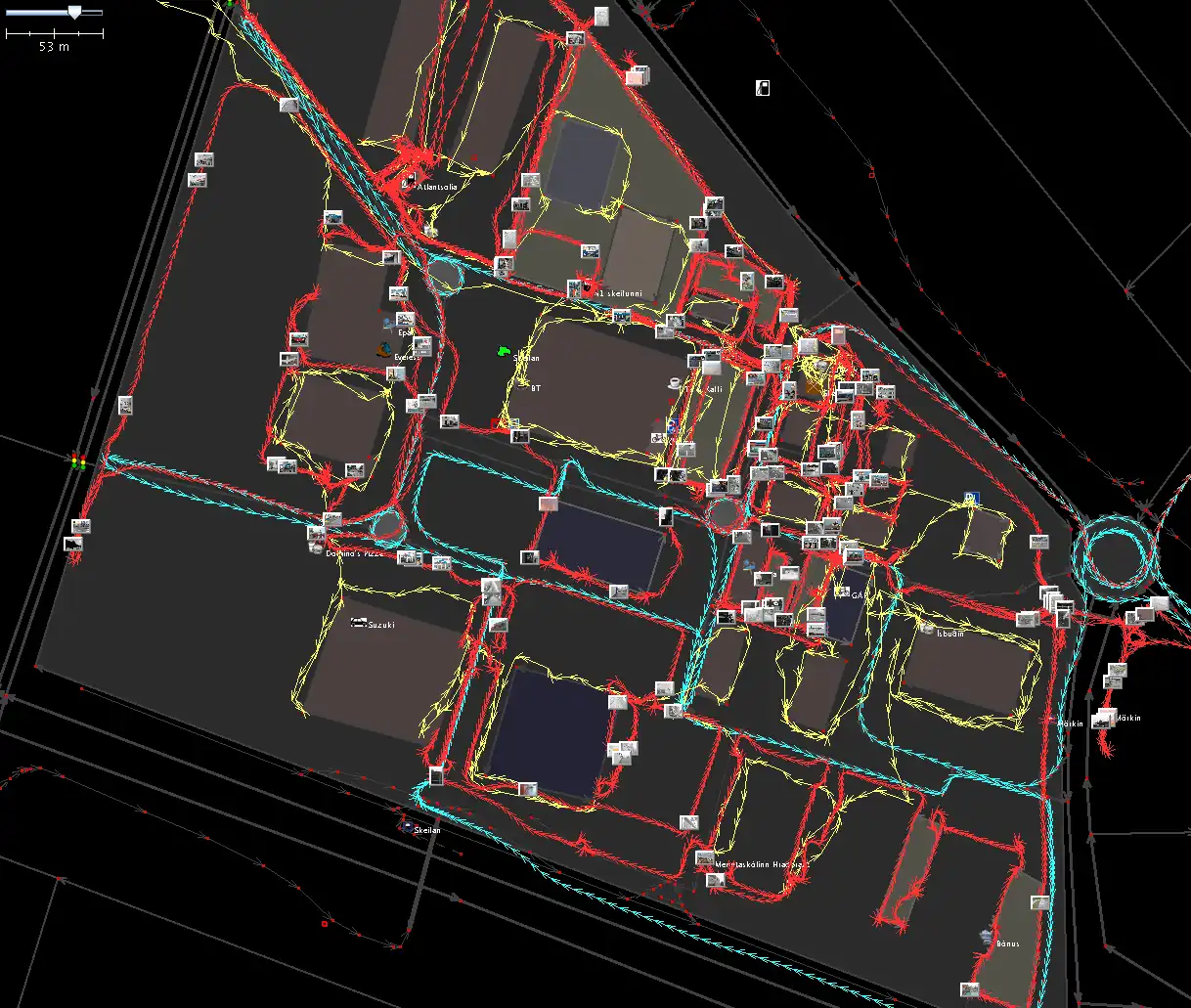 - Let's take the dimensions of buildings, this is especially easy e.g. south of Skeifan (the road) and east of Faxafen where most of the buildings are either really large, or part of a series of buildings that all have the same dimensions, or both.