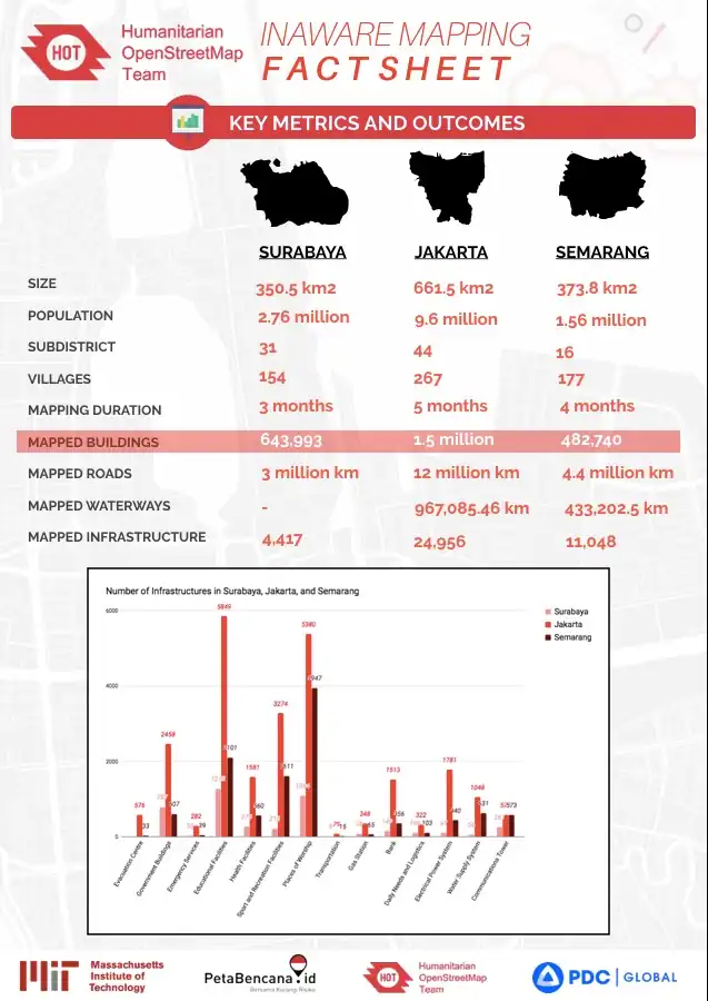 This project has been mapped in 3 cities in Indonesia. The first city was Surabaya (October 2016 - February 2017), the second city was DKI Jakarta (March - November 2017), and the third city was Semarang (February - July 2018). These mapping activities were done by the Humanitarian OpenStreetMap Team (HOT) Indonesia with cooperation and support from the local government such as city government and local disaster management agency (BPBD). The BPBD supported the regulation and permission letter to collect the data in the field. Then the local university has supported to digitize the buildings and roads through Mapathon activity. After the projects the local partners continued the project sustainability, we trained them about how to update and use the OSM data by ToT training.