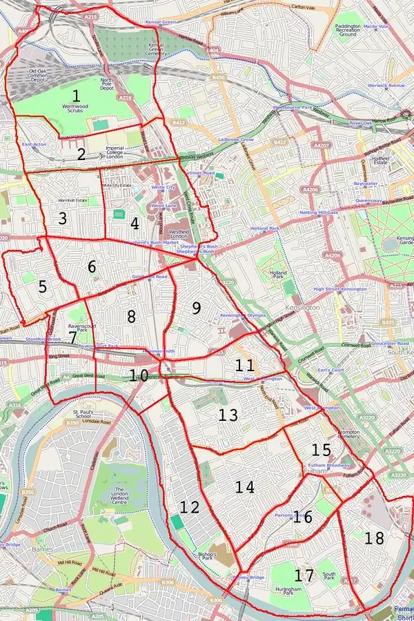 Numbers in the tables below refer to the "cake" slices shown (It's not a mapping party cake diagram, just a devision of the borough for tacking purposes)