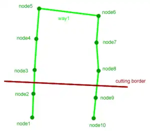 Cutting without SRTM2OSMsegmenter and without --complete-ways![]() Image 2 shows what happens: node3 to 8 are outside the cutting area and will be removed by the cutting. Their node refs in way1 become broken refs. The rendering process ignores these broken refs and assumes that node2 is followed by node9 and therefore draws an artifact connecting node2 and node9. | |