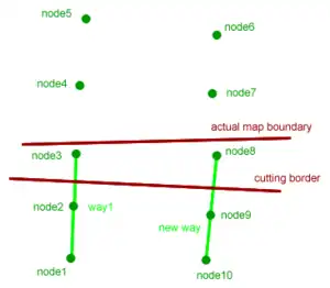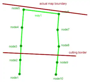 Cutting with SRTM2OSMsegmenter and with --complete-ways![]() Image 4 shows what happens: SRTM2OSMsegmenter will break down the long way1 into consecutive shorter ways. In the image the first segment would be node1 to node3, the last node8 to node10 plus a couple of segments in between that are not shown. Both way1 and new way will be rendered without artifacts because of --complete-ways. And because both ways are a lot shorter than the original way1, the map boundary will have to be moved only a little to the outside to acommodate the ways. |