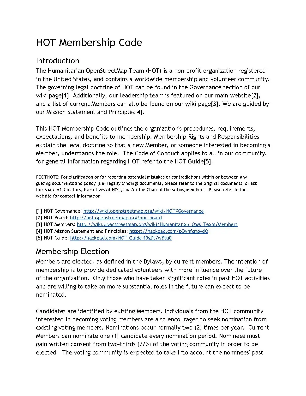 The Humanitarian OpenStreetMap Team Community wrote a Code of Conduct in 2013. During the 2014 Annual Meeting members were asked to accept it all new members have been asked to do so since.