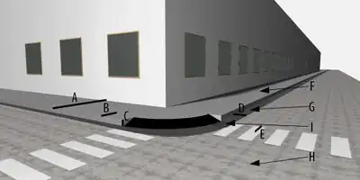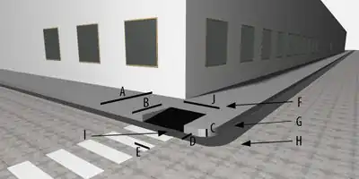 Alapvetően legtöbbször a két fotón látható járda-útátjáró sarokkal találkozunk. Így ezek taggelése lenne a legfontosabb. A legfontosabb jellemzők a rajzokon A-J vannak jelölve. Rajztechnikai okok miatt tettük "két oldalra" a jellemzőket, értelemszerűen az egyes jellemzők a sarok mindkét oldalán eltérőek, ezt az oda csatlakozó utszakaszra jelölhetőek.