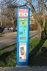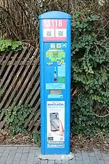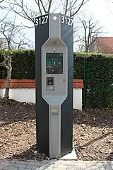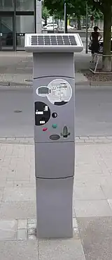 Négyzetes hasáb alakú automata, egy nagy fehér P betűvel a tetején. Létezik napelemes és napelem nélküli változata is. Ez utóbbi nevében nem Solar, hanem AC van (lásd lejjebb), és törlendő az electricity=solar címke.A *-gal jelölt címkék magyarázata