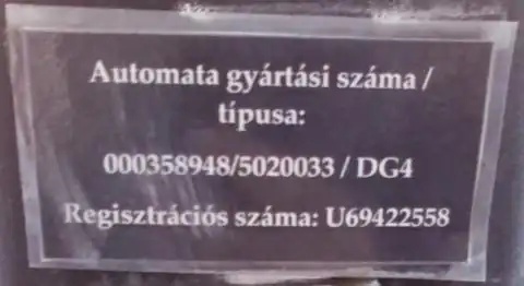 Automata gyártási száma / típusa: 000358948/5020033 / DG4 Regisztrációs száma: U694422558