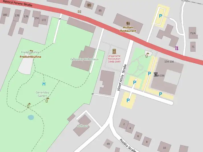 És egy nem teljes kétnyelvű magyar-német nézet Lábatlanról. A német szövegeket a name:de kulcsból jeleníti meg - és ahol hiányzik ott majd pótolni kell. Példaképpen az 1848-as emlékműnél lehet legjobban szemléltetni az OpenStreetMap adatbázisának rugalmasságát, a különböző adatokkal: