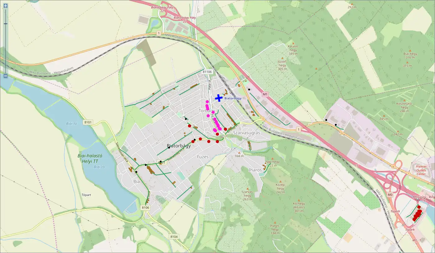 - Biatorbágy térképes nyilvántartásai: Kataszteri nyilvántartás házszámokkal és telekhatárokkal (OpenStreetMap háttér réteg felett közvetlenül látszanak az eltérések!), természeti és építészeti értékek, közművek, építési övezetek, védett objektumok, településkép. Figyelem: már távolról is lehet benne találni házszám hibákat ezért még ellenőrzésre is csak másodlagos forrásokkal alkalmas!