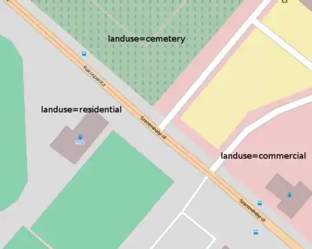 - A landuse-ban sok egyéb objektum előfordulhat - lehet benne focipálya (leisure=pitch), park (leisure=park!), boltok, gyakorlatilag az egész térkép egy nagy egyrétegű landuse-ra van rárajzolva.