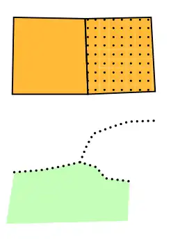 | boundary | 414 Distinct cultivation boundary, 416 Distinct vegetation boundary | 414 Distinct cultivation boundary, 416 Distinct vegetation boundary | 414, 416 not used in ISMTBOM | Different type of boundaries between vegetation areas, when not not shown with other symbols (fence, wall, path, etc.) | type=distinct_cultivation/ distinct_vegetation |