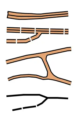 | tunnel; bridge:yes (?) | ISOM#512 Bridge / tunnel | ISSOM#512.1 Bridge | ISMTBOM#518 Tunnel | Bridges and tunnels are represented using the same basic symbols. | part:extent/opening/edge. width=[meter].? |