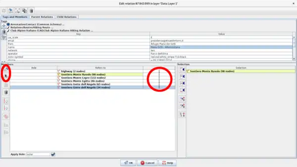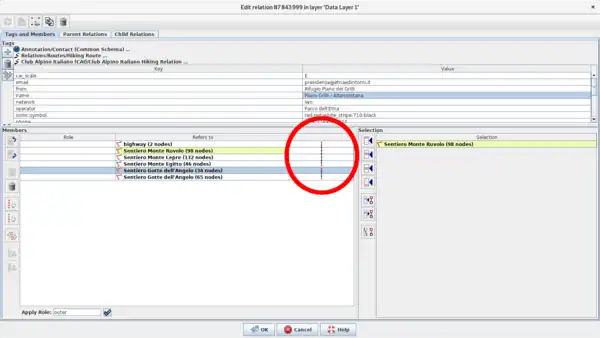 I percorsi ufficiali del CAI devono essere mappati anche come relazione (per chi vuole approfondire il concetto di relazione legga la pagina sulle relazioni), tutte le informazioni riportate nella tabella sotto devono essere nella relazione e non nei campi dei vari segmenti che la compongono. Nella relazione vanno inseriti anche tutti i punti di posa che riportano informazioni sul percorso che si sta mappando.
