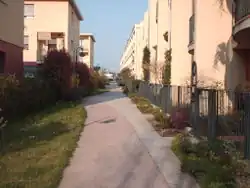 | strada solo pedonale (vialetto) di accesso ad una serie di case con fondo parte in cemento e parte in erba |