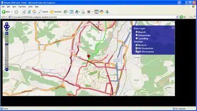 Questo esempio mostra la mappa OSM con le sue varianti Mapnik, Osmarender e Cyclemap, un layer con un marker nella posizione indicata come centro della mappa ed un layer con la traccia GPX.
