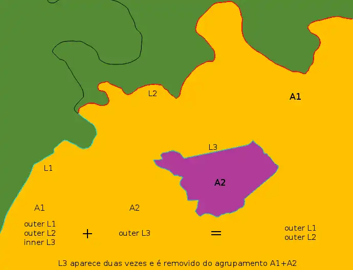 A seguir as diversas linhas de cada entidade são verificadas, elas devem formar vários anéis fechados. Fazemos a ligação das linhas tal e qual o jogo de domino até encontrar todos os anéis, depois detetamos os anéis interiores e exteriores (inner ring = um anel inteiramente incluído noutro), acabando assim a construção de um multi-polígono.