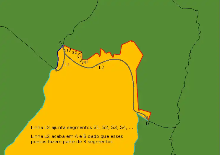 Quando todos os polígonos foram decompostos em segmentos, as linhas são criadas ajuntando todos os segmentos que se seguem e que só tem uma conexão :