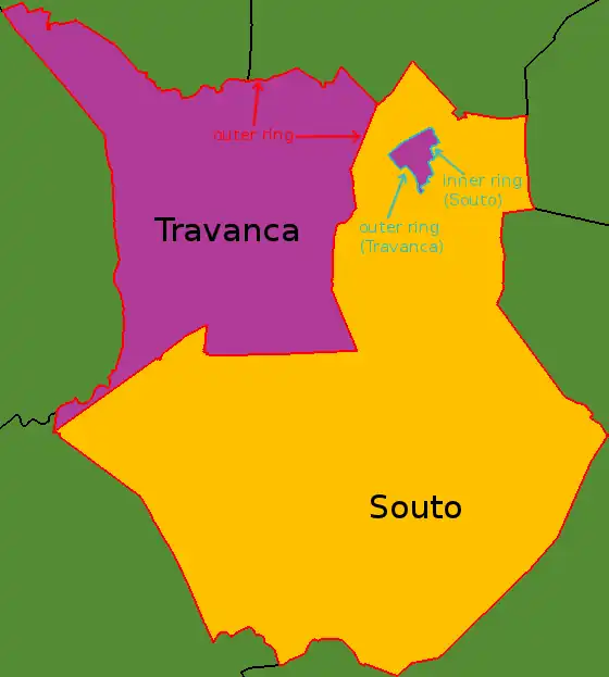Um exemplo de freguesias com enclave e exclave : a freguesia de Souto e a freguesia de Travanca ambos no concelho de Santa Maria da Feira, distrito de Aveiro :